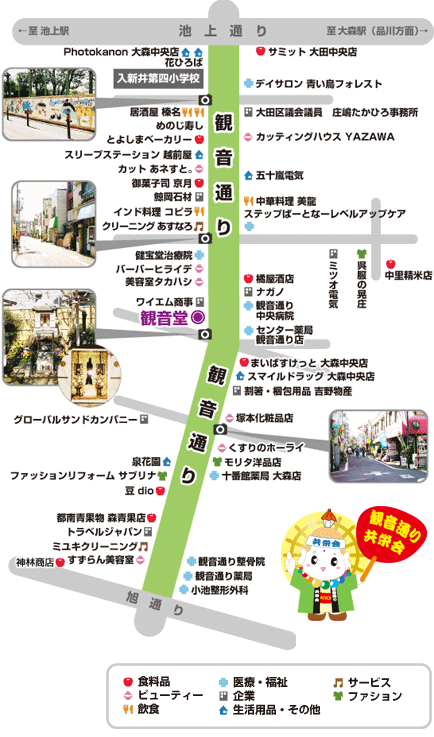 品川と池上本門寺の門前町・池上を結ぶ池上通りに面して「KANNONDORI」のアーチがあり、くの字型に南へのびています。住宅街の真ん中で、生活に根付いた親しみやすい店が多く、誕生以来の長い年月を地元住民の皆様とともに歩んでまいりました。
