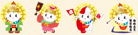 首のあたりの虹の七色の宝珠は、希望を表している。 大きな赤いポケットは、「ご利益ポケット」。中には、福袋やお札、福飴などが入っている。